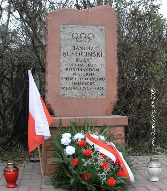 OŻARÓW MAZOWIECKI. Janusz Kusociński "Kusy" - tu stał jego rodzinny dom, w którym spędził dzieciństwo i młodość. Grób Janusza Kusocińskiego znajduje się na cmentarzu w Palmirach, pośród grobów wielu pomordowanych przez hitlerowskiego okupanta w czasie II wojny światowej. |